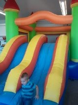 When we got into Imagine Play the boys told me about taking off my shoes and exactly where I should look on as they played. The first and most popular stop today? The bouncy house and slide!