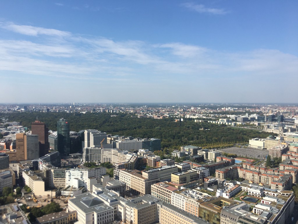 Our time came. The balloon can hold up to like 30 people and there were four of us for this moment’s ride. We all four climbed on board and had plenty of room to walk around and up we went. Up up up up….Ana and I breathing in the new air as we went up. Later, when we saw the balloon from afar we could see the sway but from up there it felt as though we were just gliding and finding our spot. Once we got to the place we would reside for the next 15-20 minutes both Ana and I had big smiles. This was incredible. We could see all around Berlin. The balloon slightly continued to turn with the wind so our perspective shifted a little each moment. Ana and I pointed out different landmarks to one another and looked amazed at the city before us. We pointed the direction of our home and the beauty of the day. I chatted with the guy in charge of the balloon and he commented on how he actually enjoyed these smaller rides so he could point things out to us as well. The weather was perfect.