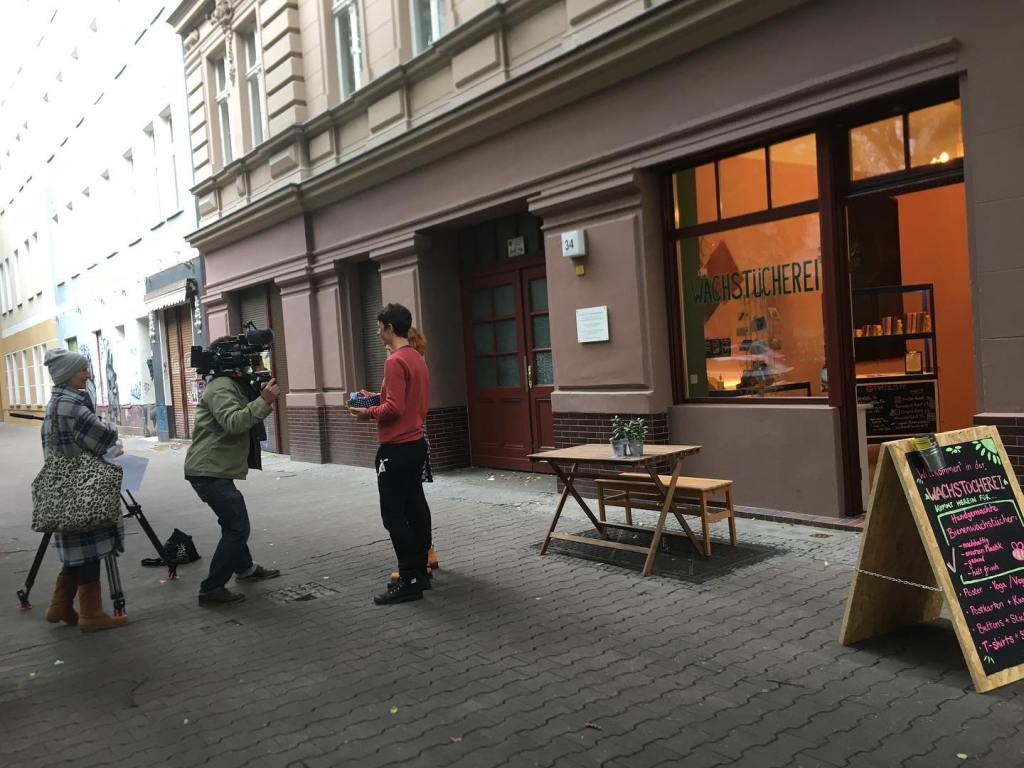 This morning the rains arrived as planned and the chill never left so in mist and 40 degrees Ana and I headed out to buy coffee along the way to our friends’ new shop, Wachstuecherei (the Wax Wrap shop). Chelsea and Anna have been making wax wraps for markets for the past few years and have finally made their business into a shop. They are within a 20 minute walk from us and a German news tv station took notice. They made a video today and we were lucky enough to be able to help as staged customers.