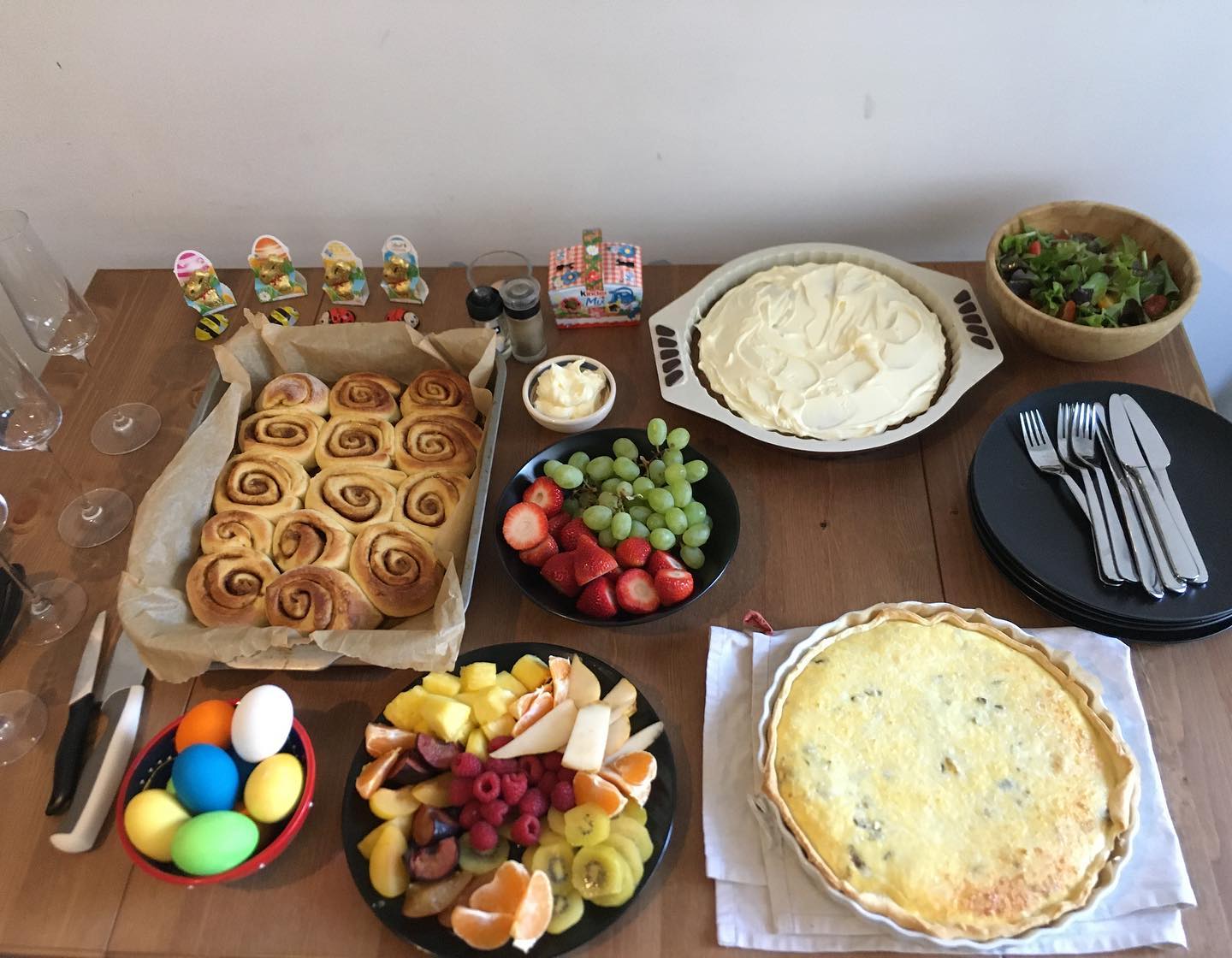 Because of our isolation and lockdown and cautionary lives, we felt like this was definitely the event of the season. We pulled out all of the stops. They arrived at noon and we began with mimosas and smiles. I went all out for brunch and made quiche for the first time, from scratch cinnamon rolls and grandma’s carrot cake. I bought so much fruit and threw together a lovely green salad with colorful little tomatoes. We had coffee and bacon and little chocolate bunnies for everyone.