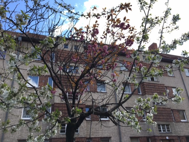Each morning that I take the dogs out, we more than likely take the same route around our neighborhood. It is about a 15 minute walk and we can do it in our sleep (or pre coffee in my case). It means we get to observe the same things each morning. On this particular route, the place where we loop around is down a short street that is lined with cherry trees, two different types, ones with bright pink flowers and ones with white. Directly in the middle of this row of trees is my absolutely favorite one because somehow this little tree is both kinds of tree, pink and white. Somehow it looks as though the white tree was grafted into the pink one…or perhaps it started white and somehow the pink one was grafted on top.