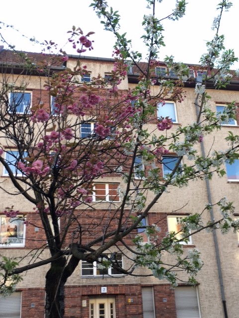 It is both. I love this tree. I love that it includes both flowers and is just so amazing to watch. I have been watching it each morning because this year the blossoms have come later than normal. It is a cooler year. The white blossoms were first to burst and the pink blossoms are taking their time. This past week has been the first week that I have noticed the first pink blossoms start to emerge. It is as if they are cautious about it. There is another spot full of these pink cherry trees in our neighborhood that is just glorious when they blossom. The pups and I walked there for our longer walk yesterday and you can see them just about completely ready to burst open. The most adventurous little blossoms are peeking out.