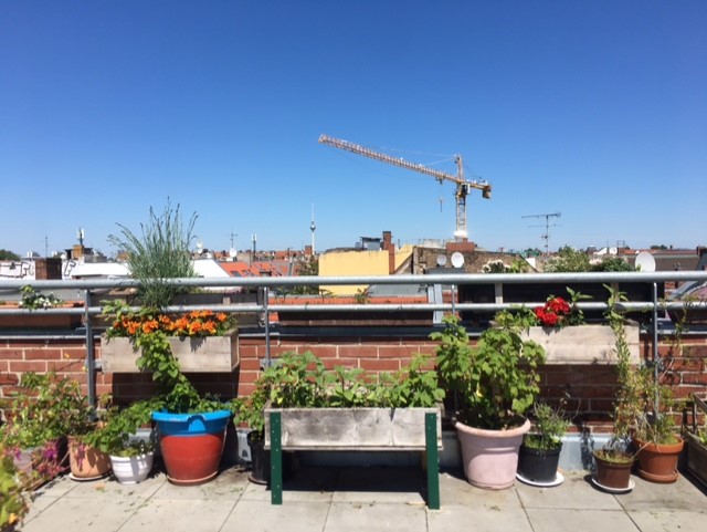 This view (hopefully with less construction) will be the main decoration to our celebration. It is the rooftop from Refugio Sharehaus where I volunteered for my first year and a half or so in the coffee shop that was open pre covid on the first floor. Most of this building is refugee housing but the rooftop is perfect for what we want to do . It is a thriving rooftop with things growing, bees hiving and places to sit and relax.