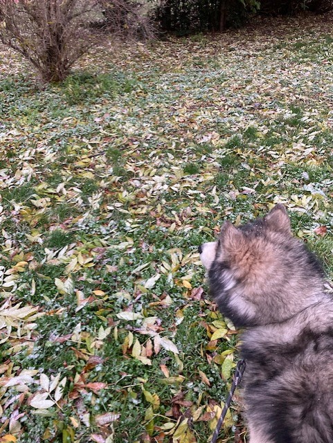 This morning I bundled up as I prepared to go outside with the pups and what I found was a thin layer of snow and some dusting coming down. Our husky was overjoyed but our little dog and I were all about walking quickly and efficiently through it.