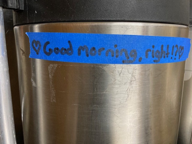 I welcomed a group last night. I will welcome two more groups tonight. There will be a personal retreat happening as well on site and a group left this morning that I welcomed on Tuesday. On a rare day so far when there were no groups on site on Tuesday, the staff made coffee and I had to smile with the note. I took a deep breath and thought again for umpteenth time this week about how lucky I am to be here.